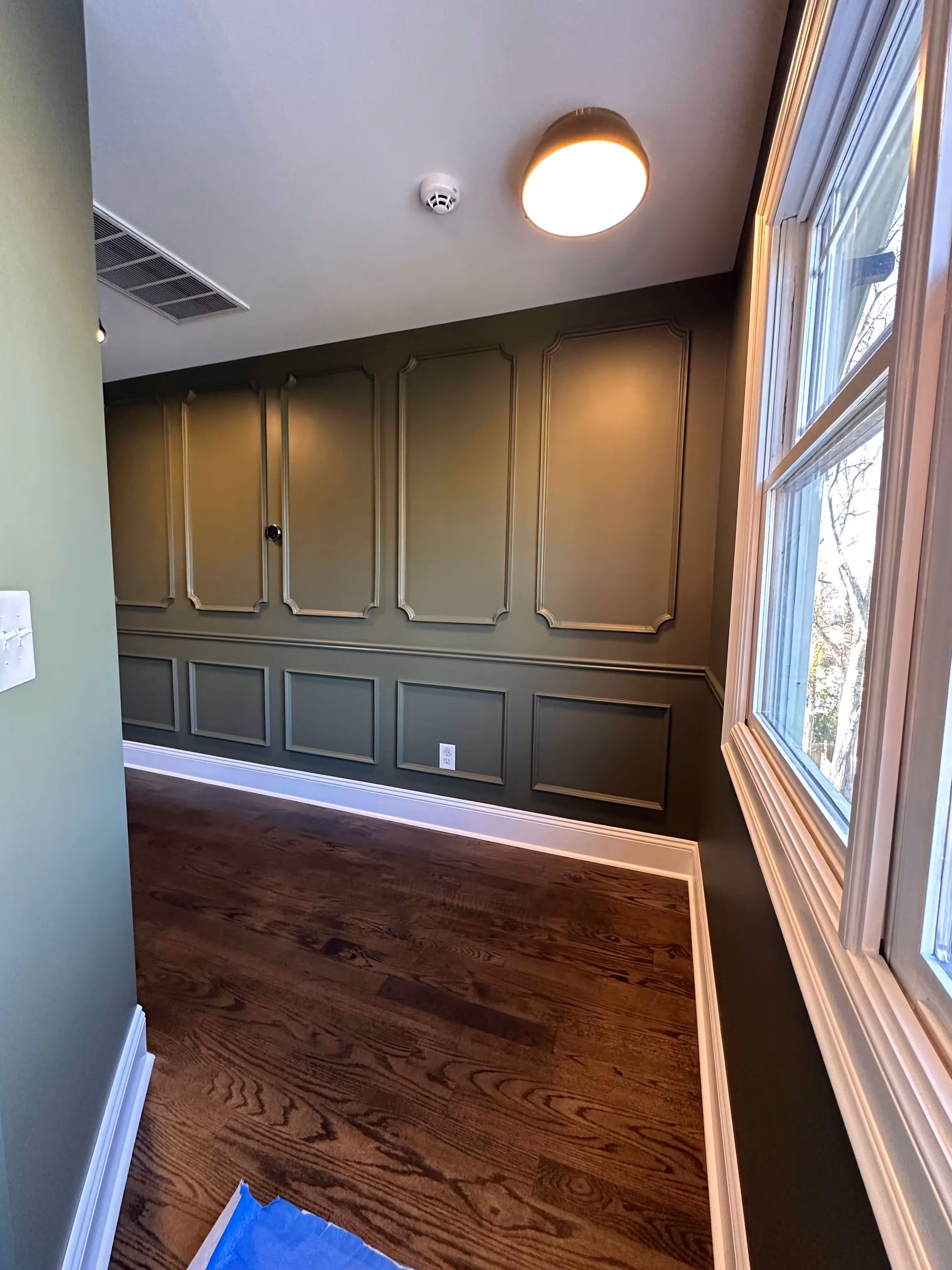 The rich olive-toned green selected for the trim wall creates warmth and drama—especially when contrasted against the clean white ceiling and baseboards. It’s a bold choice, but one that works beautifully with the home’s dark wood flooring and updated fixtures.